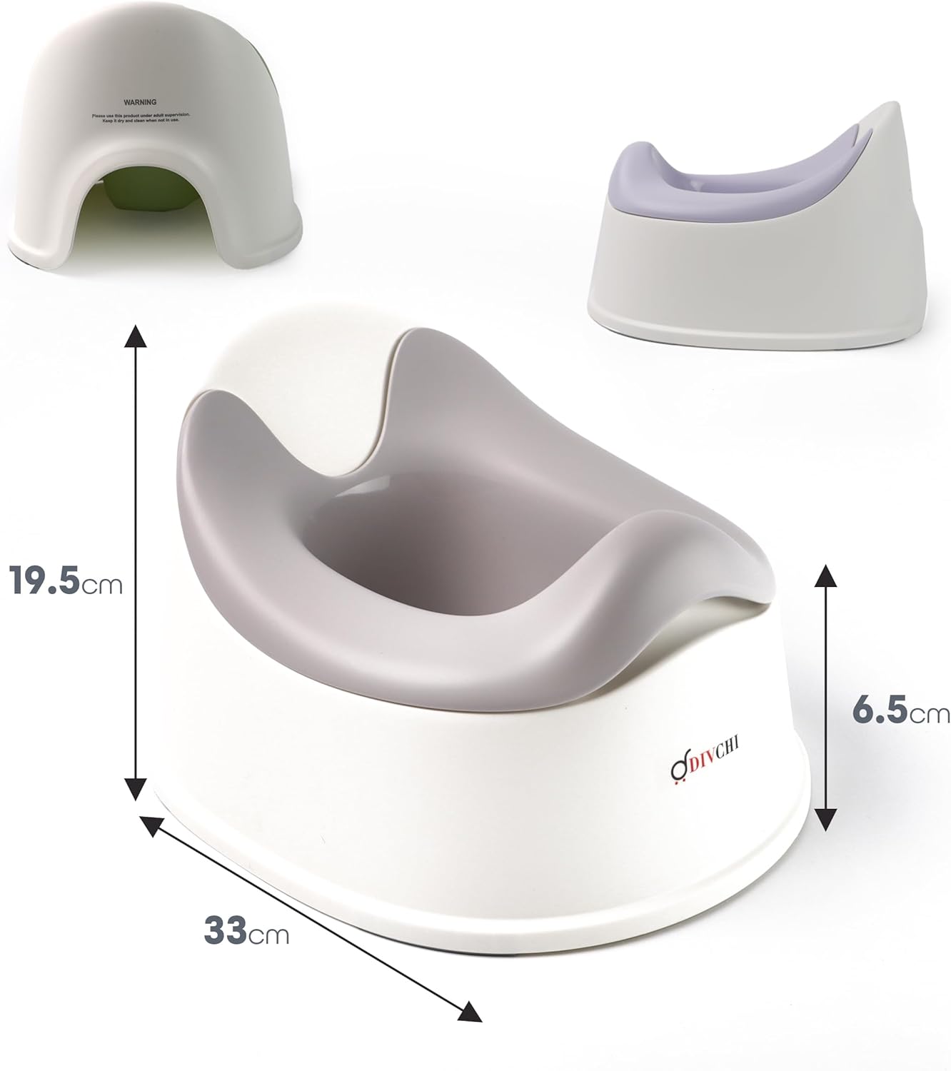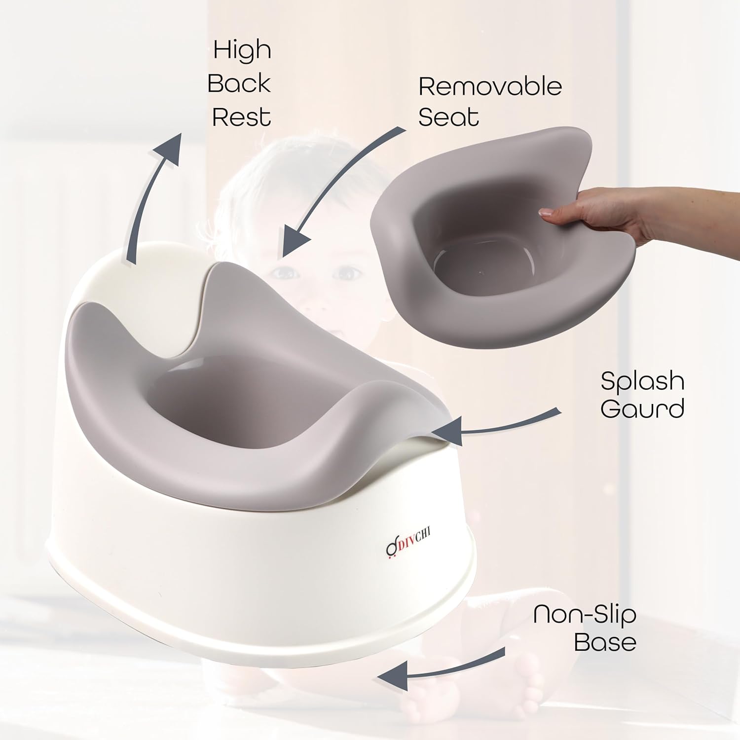 Практично: Благодарение на компактната големина и ергономскиот облик на нокширот со отстранлива чинија, лесно можете да ја истурите содржината во тоалетот.Рачката на чинијата го олеснува носењето и истурањето. Со своето ергономско седиште и висок потпирач за грб, вашето дете може удобно да седи во бањата, на терасата, па дури и во дневната соба.