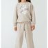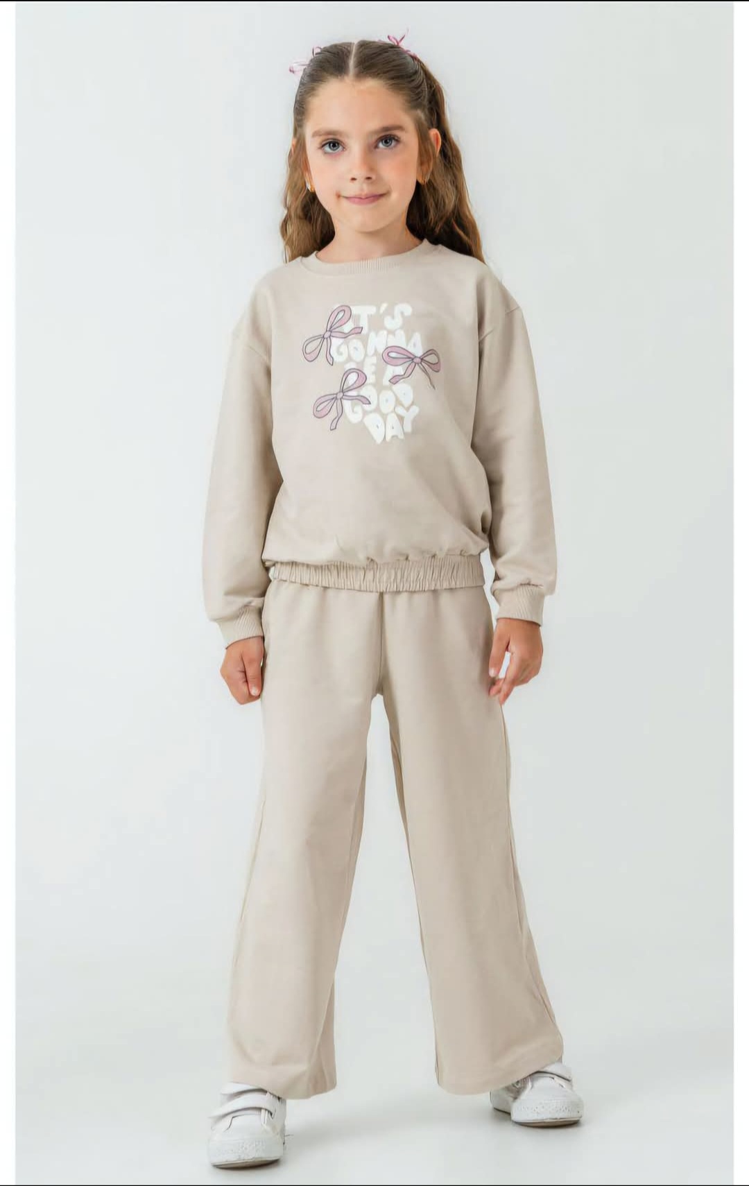 Комфор и стил во едно! Овој слаток сет комбинира блуза со декоративен принт и  долни широки тренерки со еластичен појас – совршена комбинација за активни денови и слободно време.