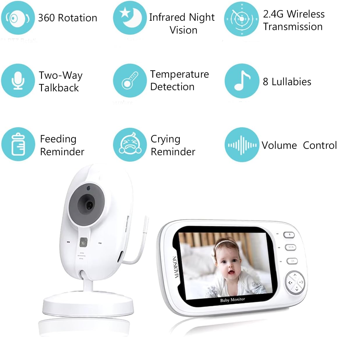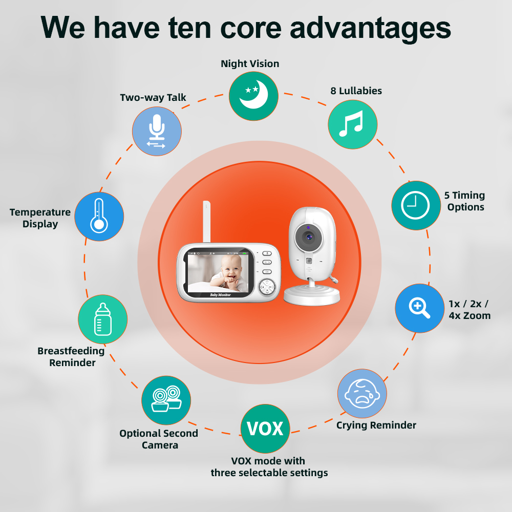 Овој монитор не е само технолошки напреден, туку е и практичен за секојдневна употреба. Со неговите интелигентни функции, ќе бидете секогаш поврзани со вашето бебе, без разлика дали сте во соседната просторија или надвор од домот.